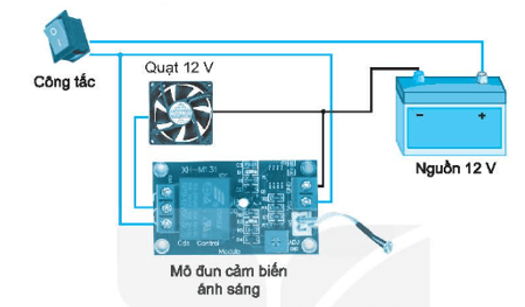 Khi có nguồn cấp cho mạch điện, nếu ánh sáng cấp vào cảm biến ánh sáng thay đổi (sáng hoặc tối), mach điện có thể tự động điều khiển để bật hoặc tắt điện vào quạt: trời tối thì mạch tự động cung cấp điện để quạt quay, trời sáng thì mạch tự động ngắt điện vào quạt.