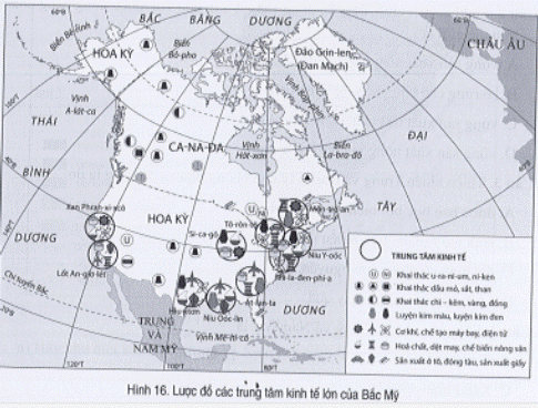 Yêu cầu b) Các trung tâm kinh tế lớn ở Bắc Mỹ tập trung ở ba khu vực chính: