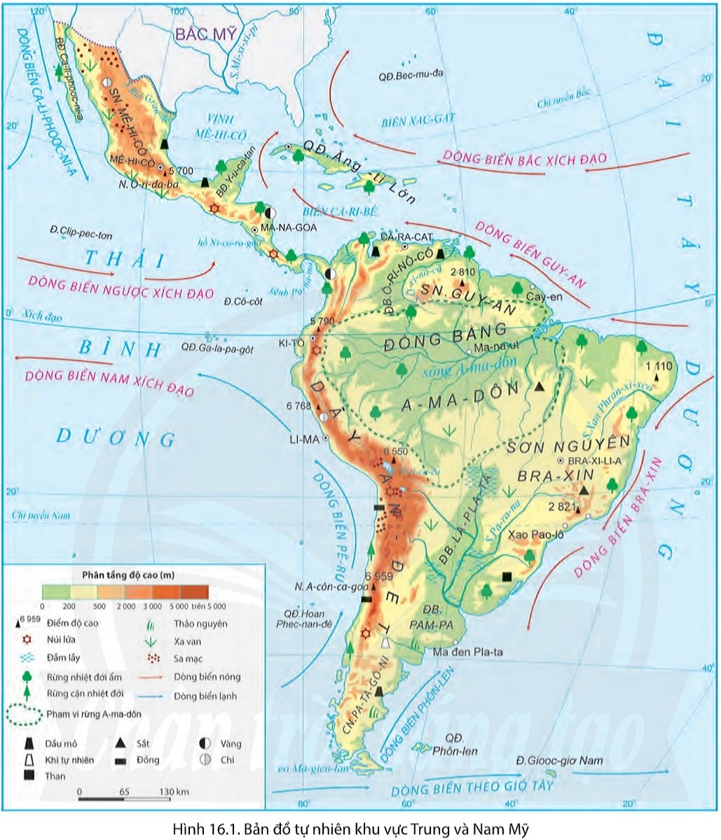 Quan sát hình 16.2 và đọc thông tin trong bài, em hãy trình bày sự phân hóa tự nhiên của khu vực Trung và Nam Mỹ theo chiều bắc - nam.