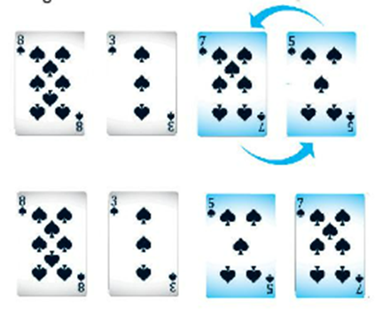 Vòng lặp thứ hai: So sách quân 9 với quân 10, vì 10 > 9 không đúng tử tự nên quân 9 đổi chỗ cho quân 10. So sánh quân 9 với quân 6, vì 6 < 9 đúng thứ tự nên giữ nguyên vị trí. Kết thúc vòng lặp thứ tự các quân bài như sau: Quân 4, quân 6, quân 9, quân 10.