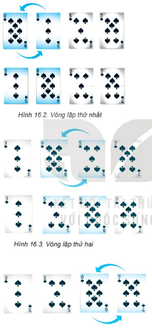 Bạn An sắp xếp các quân bài bằng cách tráo đổi vị trí theo các vòng lặp như trong các hình sau: