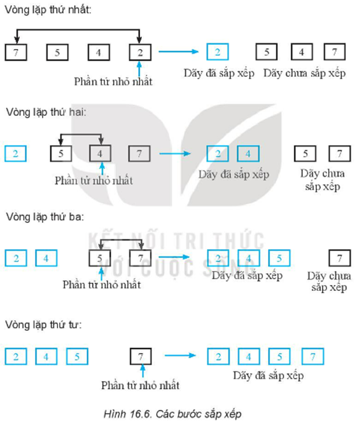 Em hãy quan sát Hình 16.6 và cho biết đó là cách sắp xếp theo thuật toán nào?
