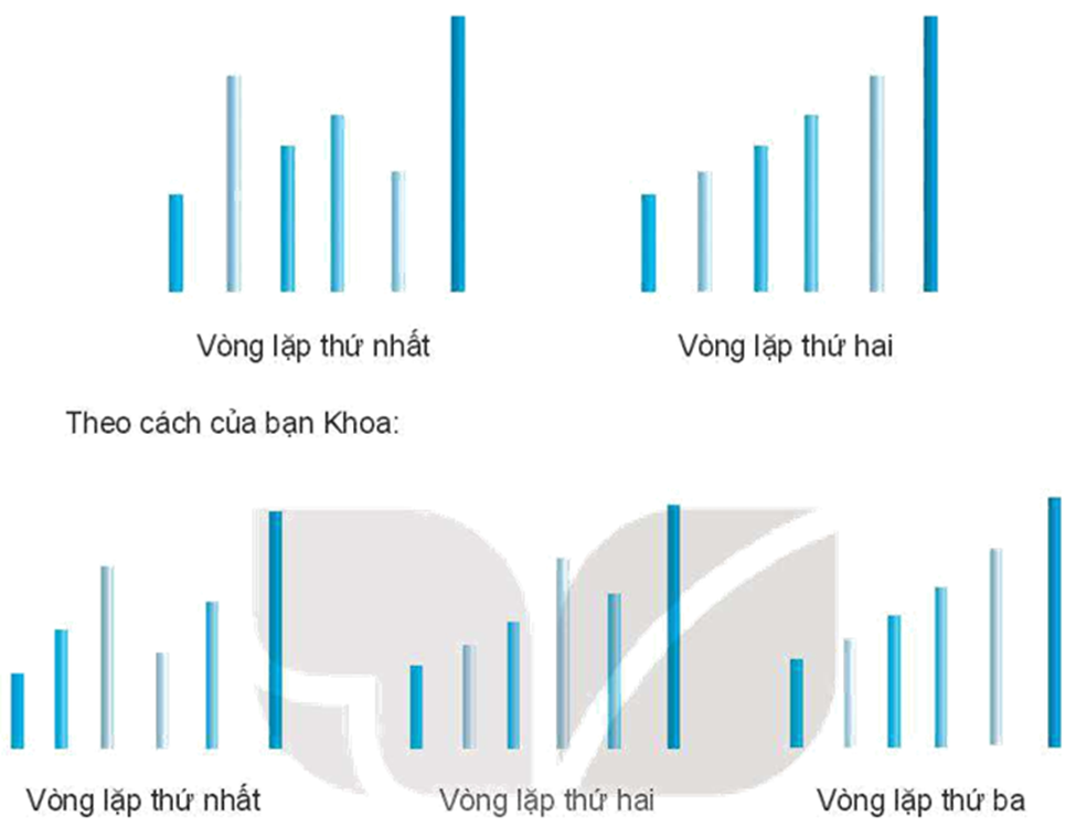 Khoa: Tớ cầm que cuối cùng, nếu que trước ngắn hơn tớ sẽ chuyển sang cầm que ngắn, ngược lại nếu que trước dài hơn tớ sẽ đổi vị trí hai que tính. Lần lượt làm như vậy đến que tính đầu tiên. Sau lượt đầu, que tính ngắn nhất sẽ được đưa về vị trí đầu tiên. Ở lượt thứ hai, que tính ngắn thứ hai sẽ được đưa đúng vào vị trí, cứ như vậy đến khi các que tính được sắp xếp theo đúng thứ tự.