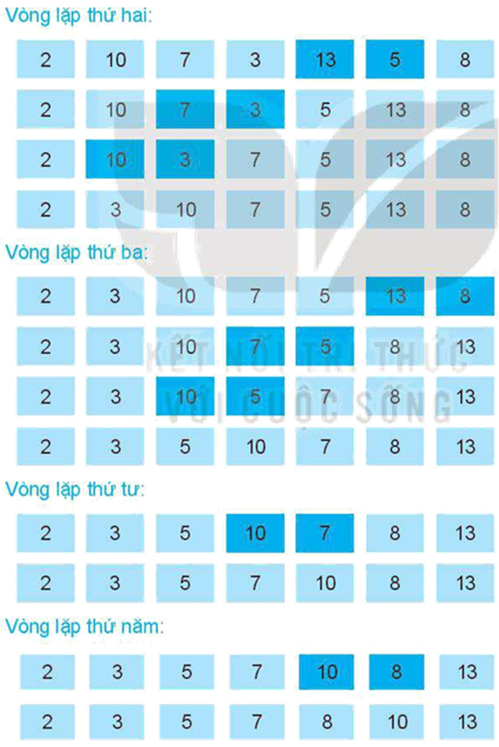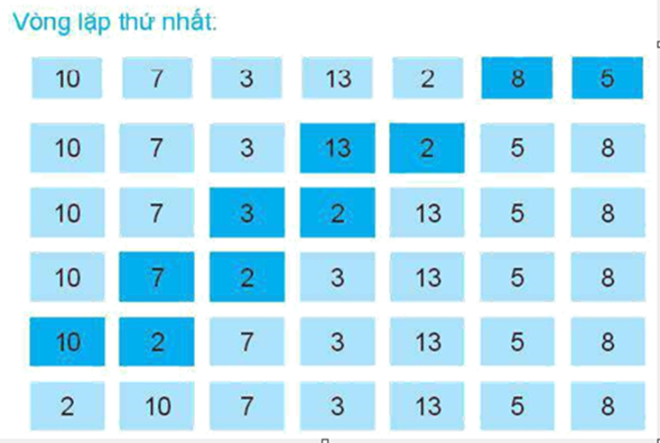 Em hãy quan sát dãy gồm các số 10, 7, 3, 13, 2, 8, 5 được thay đổi vị trí theo từng bước như trong Hình 16.9.