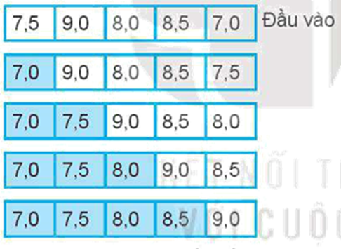 Kết quả các vòng lặp thực hiện sắp xếp nổi bọt để sắp xếp điểm theo thứ tự tăng dần: