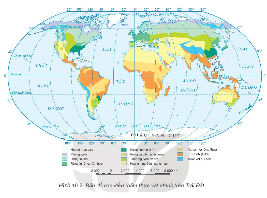 Dựa vào hình 16.2 SGK, hãy kể tên các thảm thực vật chính từ Cực về Xích đạo.