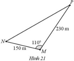 Gia đình bạn An sở hữu một mảnh đất hình tam giác. Chiều dài của hàng rào MN là 150 m, chiều dài của hàng rào MP là 230 m. Góc giữa hai hàng rào MN và MP là 1100 (Hình 21)