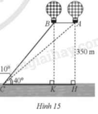 Hai khinh khí cầu được thả lên cùng độ cao là 350 m (ở hai vị trí A và B). Tại vị trí C trên mặt đất, người ta quan sát và đo được \(\widehat {ACH} = 40^\circ ,\widehat {ACB} = 10^\circ \) (Hình 15). Tính khoảng cách giữa hai khinh khí cầu (làm tròn kết quả đến hàng đơn vị của mét).
