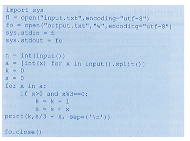- Bước 3. Duyệt với mọi i: Nếu ai > 0 và ai chia hết cho 3 thì tăng k và tích luỹ ai vào s.