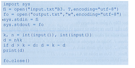 Xét bài toán: Các điểm dừng đón, trả khách của xe buýt cách đều nhau một đoạn k mét. Điểm dừng đầu tiên ở đầu phố. Như vậy tính từ đầu phố, xe buýt dừng ở các điểm 0, k, 2k, 3k, ... (mét). Nhà của Tâm ở ngay đầu phố. Để kết hợp rèn luyện thể lực, Tâm thường đi bộ tới trường. Hôm nay, khi đi bộ được n mét, Tâm chợt nhớ cần phải tới sớm theo lời hẹn với một người bạn nên quyết định sẽ bắt xe buýt ở trạm tiếp theo gần nhất. Hãy xác định Tâm còn phải đi thêm bao nhiêu mét nữa.