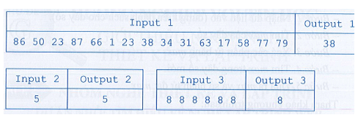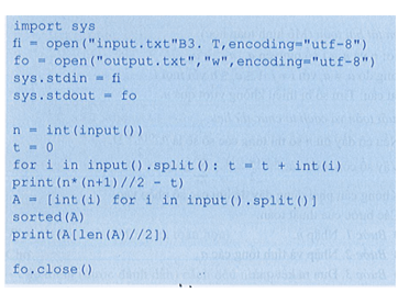 Xét bài toán: Cho dãy số nguyên A = (a1, a2, …, an). Phần tử x của dãy được gọi là phần tử trung vị nếu nó lớn hơn hoặc bằng n2 phần tử của dãy và nhỏ hơn hoặc bằng các phần tử còn lại trong dãy. Ví dụ, với A = (8, 1, 6, 3, 9, 2, 3, l, 7) trung vị là phần tử có giá trị là 5. Tìm và đưa ra giá trị của phần tử trung vị của dãy A bất kì.