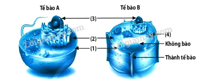 b) A – Tế bào động vật, B – Tế bào thực vật.