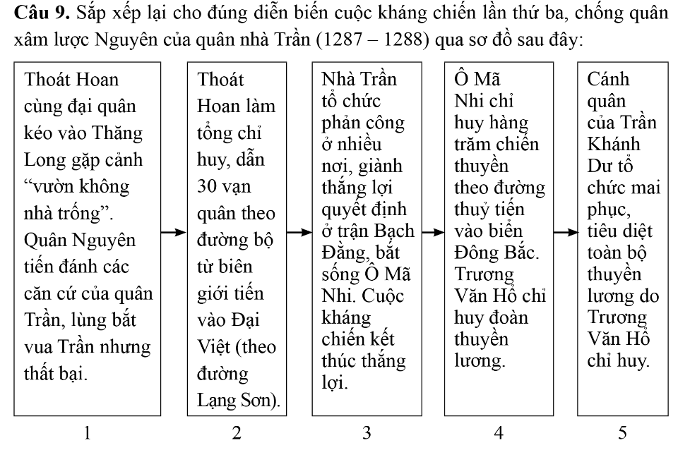 Từ kiến thức được học, ta sắp xếp các ý theo đúng diễn biến cuộc kháng chiến chống quân Mông – Nguyên lần thứ ba là: 2 => 4 => 1 => 5 => 3