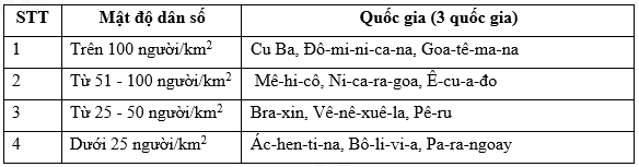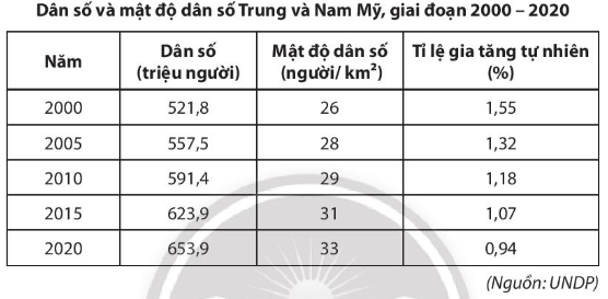 - Mật độ dân số của Trung và Nam Mỹ có xu hướng tăng lên, từ 26 người/km2 năm 2000 lên 33 người/km2 năm 2020.
