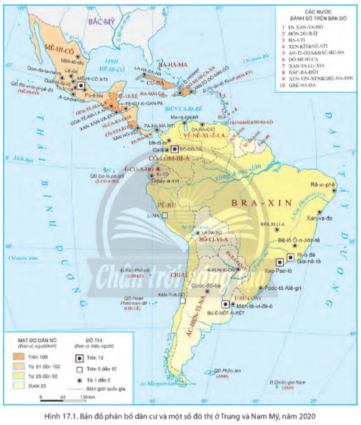 - Các đô thị có số dân từ 1 đến 5 triệu người ở Trung và Nam Mỹ: La Pa-xơ, Coóc-đô-ba, Bra-xi-li-a, Xan-va-đo, La Ha-ba-na, Xan hô-xê…