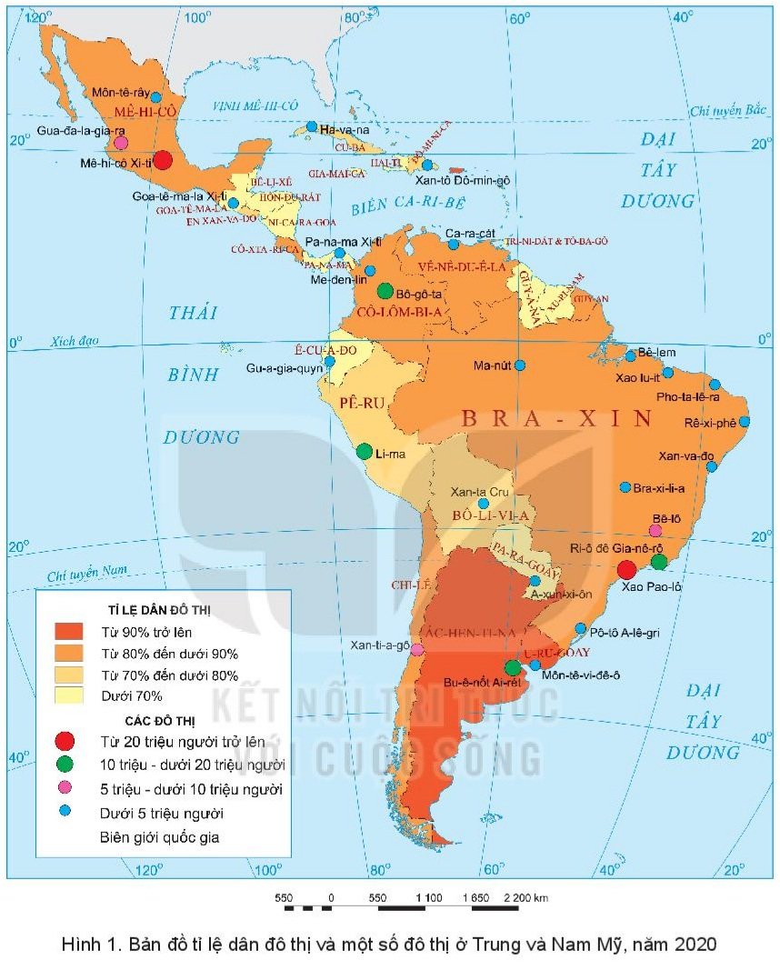Đọc thông tin mục b (Vấn đề đô thị hóa) và quan sát hình 1 (Các thành phố trên 10 triệu người được kí hiệu bằng hình tròn màu xanh lá và màu đỏ).