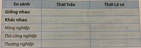 Hãy lập và hoàn thành bảng so sánh về tình hình kinh tế thời Trần với thời Lê sơ (theo mẫu dưới đây). Thời Lê sơ Thời Trần So sánh Giống nhau Khác nhau Nông nghiệp THC Thủ công nghiệp Thương nghiệp