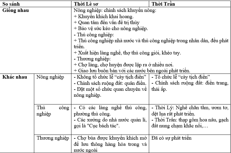 1. Tình hình kinh tế thời Lê sơ có điểm gì giống và khác với thời Trần? Hãy lập và hoàn thành bảng theo mẫu dưới đây: