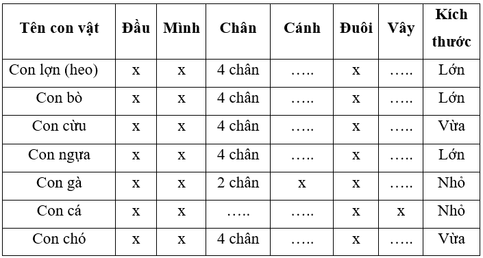 Quan sát hình và viết vào chỗ (…) để hoàn thành nội dung trong bảng sau (theo mẫu).
