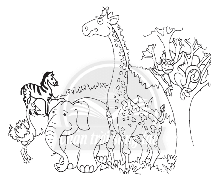 Tên của các động vật trong bức tranh là: ngựa vằn, đà điểu, voi, hươu cao cổ, khỉ