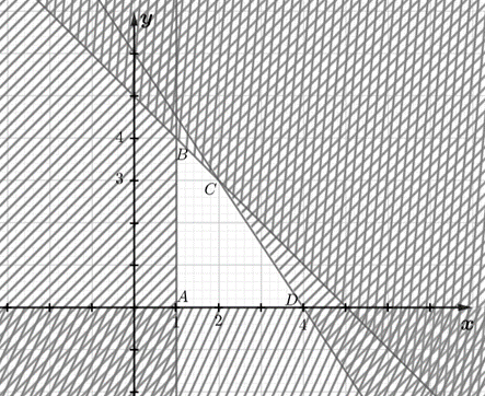 Miền nghiệm của hệ bất phương trình là miền trong tứ giác ABCD với A(1; 0), B(1; 4), C(2; 3) và D(4; 0) như hình vẽ sau:
