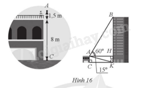Bạn Đức đứng trên nóc ngôi nhà ở độ cao 8 m. Vị trí mắt bạn Đức (tại vị trí A) cách nóc nhà 1,5 m. Bạn nhìn thấy vị trí B cao nhất của một toà nhà với góc tạo bởi tia AB và tia AH theo phương nằm ngang là \(\widehat {BAH} = 60^\circ \). Bạn Đức cũng nhìn thấy vị trí K tại chân tòa nhà đó với góc tạo bởi tia AK và tia AH là \(\widehat {HAK} = 15^\circ \), AH vuông góc với BK tại H (Hình 16). Tính chiều cao BK của tòa nhà (làm tròn kết quả đến hàng phần mười của mét).