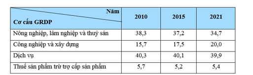 D. Ngành nông nghiệp, lâm nghiệp và thuỷ sản chiếm tỉ trọng cao nhất trong cơ cấu GRDP của vùng, tuy nhiên đang có xu hướng giảm.