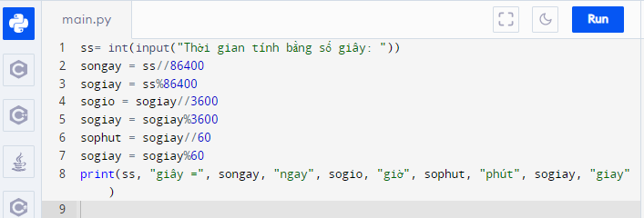Em hãy viết chương trình đổi thời gian được tính bằng số giây được nhập vào từ bàn phím thành thời gian được tính bằng ngày, giờ, phút, giây