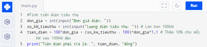 print("Tiền điện phải trả là: ", tien_dien, "đồng")