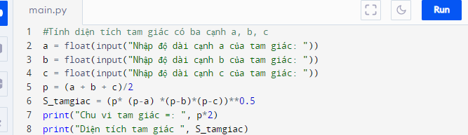 S_tamgiac = (p* (p-a) *(p-b)*(p-c))**0.5