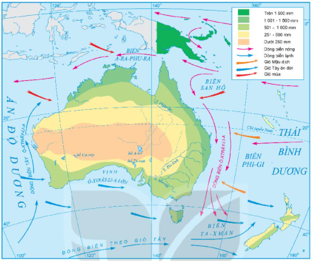 Hình 3. Lược đồ hướng gió và phân bố lượng mưa trung bình năm trên lục địa Ô-xtrây-li-a
