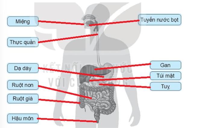 b) Các bộ phận của cơ quan tiêu hoá là: tuyến nước bọt, thực quản, túi mật, gan, dạ dày, ruột non, ruột già, hậu môn.