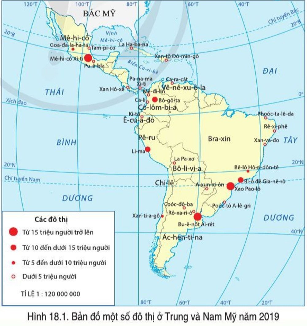 Dựa vào hình 18.1, hãy kể tên các đô thị có từ 10 triệu dân trở lên ở khu vực Trung và Nam Mỹ.