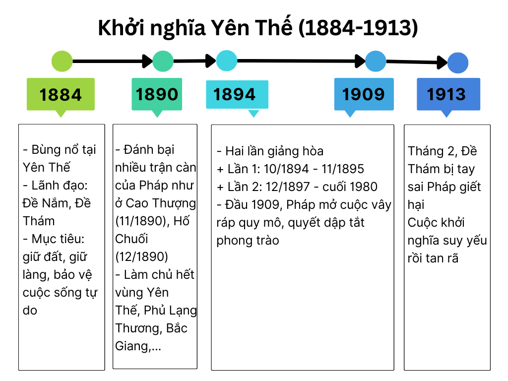 Hãy thể hiện những diễn biến chính của khởi nghĩa nông dân Yên Thế trên trục thời gian và trình bày trước lớp.