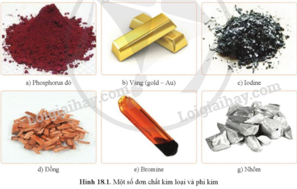 Quan sát hình 18.1, chỉ ra các đơn chất kim loại, các đơn chất phi kim