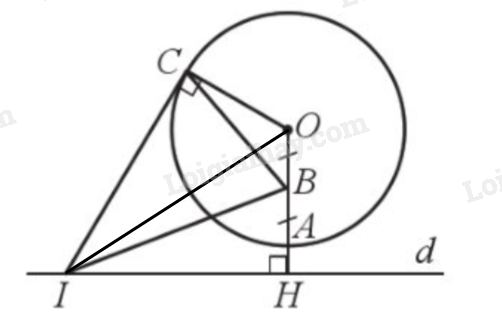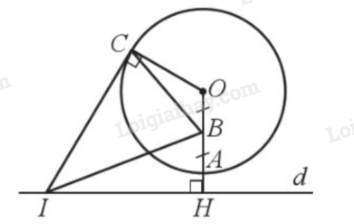 Cho đường tròn (O; 4 cm) và đường thẳng d sao cho khoảng cách từ điểm O đến đường thẳng d là OH = 5 cm. Đường thẳng OH cắt đường tròn (O) tại A. Gọi B là trung điểm của đoạn thẳng OA. Trên đường thẳng d, lấy một điểm I (khác H), kẻ tiếp tuyến IC của đường tròn (O) với C là tiếp điểm (Hình 17). Chứng minh tam giác IBC cân tại I.