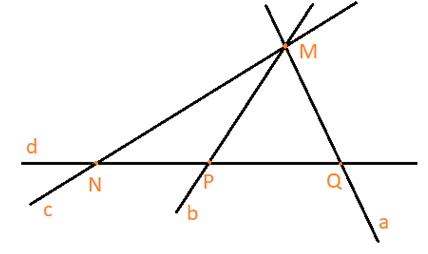 c) Các đường thằng a, b, c sao cho a đi qua hai điểm M và Q, b đi qua hai điểm M và P, c đi qua hai điểm M và N.
