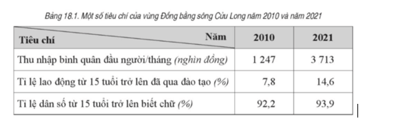 Từ năm 2010 đến năm 2021, thu nhập bình quân đầu người/tháng của vùng Đồng bằng sông Cửu Long tăng: (3713 – 1247) : 1000 = 2,5 triệu đồng.