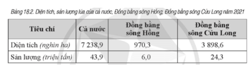 b) Năm 2021, Đồng bằng sông Cửu Long có diện tích và sản lượng lúa đều gấp hơn 4 lần Đồng bằng sông Hồng.