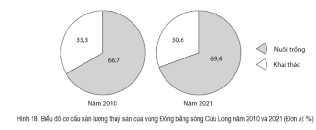 Trong giai đoạn 2010 – 2021, cơ cấu sản lượng thuỷ sản của vùng Đồng bằng sông Cửu Long thay đổi theo hướng: tăng tỉ lệ sản lượng thuỷ sản nuôi trồng (dẫn chứng), giảm tỉ lệ sản lượng thuỷ sản khai thác (dẫn chứng).