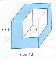 Từ một khối lập phương \(x + 3\)(cm), ta cắt bỏ một khối lập phương có độ dài \(x - 1\)(cm) (H.2.3). Tính thể tích phần còn lại, viết kết quả dưới dạng đa thức.