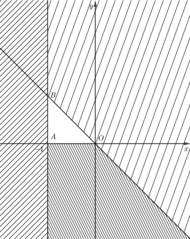 Miền nghiệm của hệ bất phương trình \(\left\{ {\begin{array}{*{20}{c}}{x \ge - 1}\\{x + y \le 0}\\{y \ge 0}\end{array}} \right.\) là: