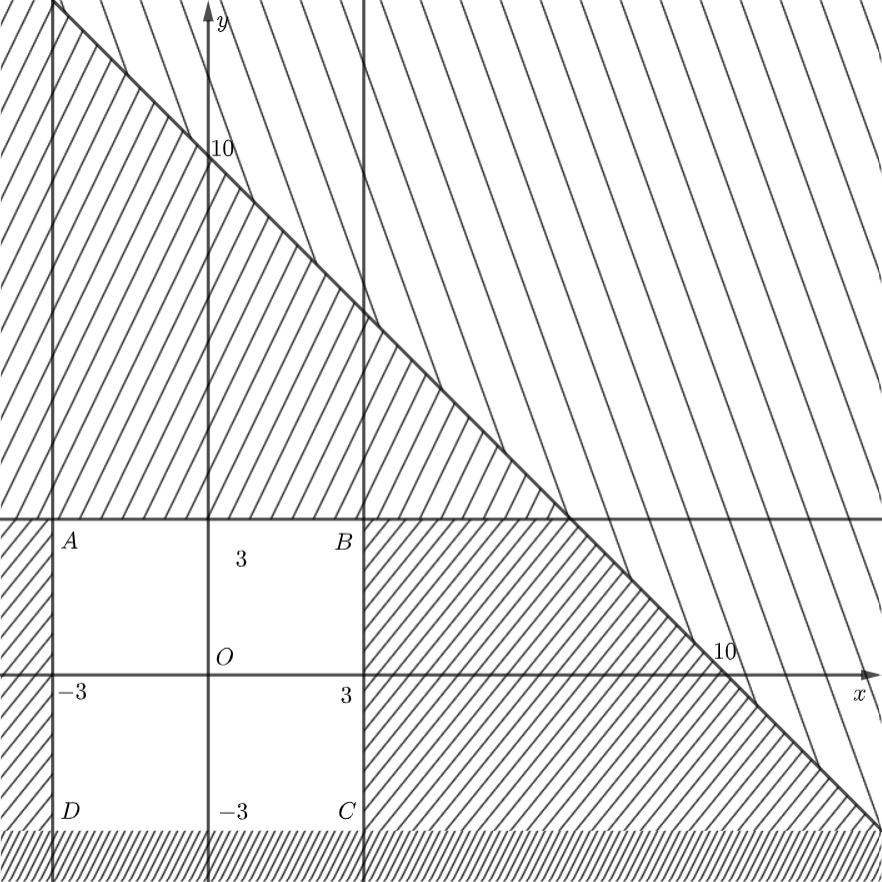 Miền nghiệm của hệ bất phương trình \(\left\{ {\begin{array}{*{20}{c}}{x + y \le 10}\\{ - 3 \le y \le 3}\\{ - 3 \le x \le 3}\end{array}} \right.\) là: