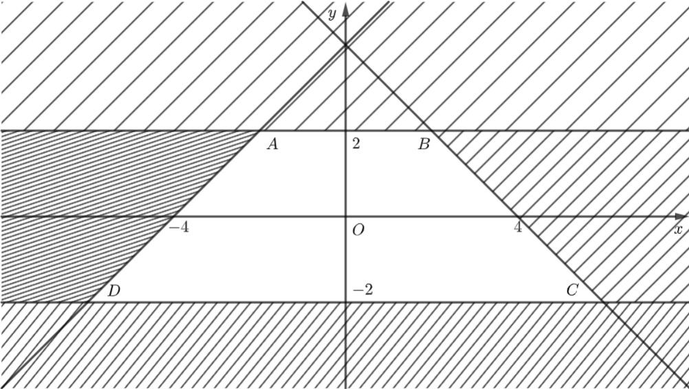 Miền nghiệm của hệ bất phương trình trên là hình thang cân \(ABCD\) với \(A\left( { - 2;2} \right),\) \(B\left( {2;2} \right),\) \(C\left( {6; - 2} \right),\) \(D\left( { - 6; - 2} \right).\)