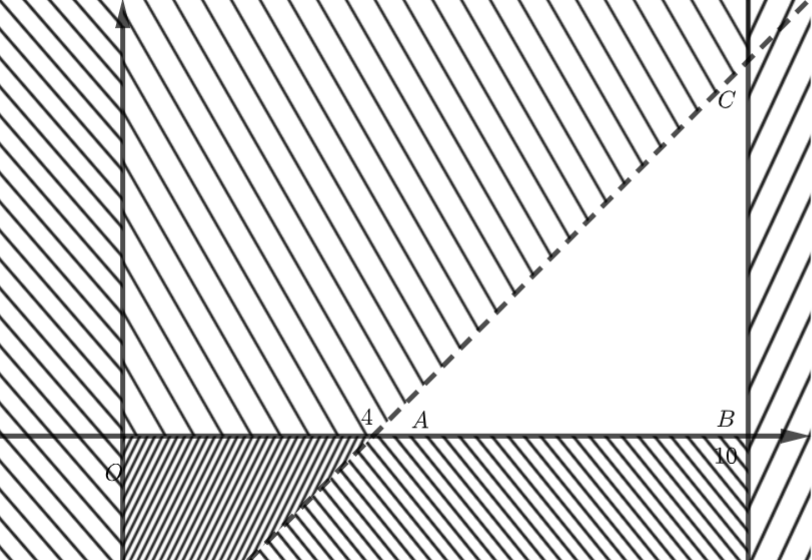 Miền nghiệm của hệ bất phương trình \(\left\{ {\begin{array}{*{20}{c}}{0 \le x \le 10}\\{y > 0}\\{x - y > 4}\end{array}} \right.\) là \(\Delta ABC\) với \(A\left( {4;0} \right),\) \(B\left( {10;0} \right),\) \(C\left( {10;6} \right).\)