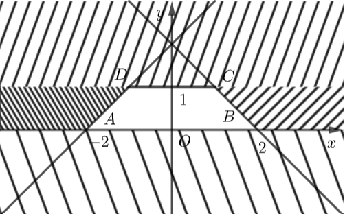 Miền nghiệm của hệ bất phương trình \(\left\{ {\begin{array}{*{20}{c}}{0 \le y \le 1}\\{x + y \le 2}\\{y - x \le 2}\end{array}} \right.\) là hình thang cân \(ABCD\) với \(A\left( { - 2;0} \right),\,\,B\left( {2;0} \right),\,\,C\left( {1;1} \right),\,\,D\left( { - 1;1} \right).\)