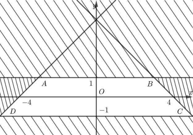 Miền nghiệm của hệ bất phương trình \(\left\{ {\begin{array}{*{20}{c}}{y \ge - 1}\\{y \le 1}\\{x + y \le 4}\\{y - x \le 4}\end{array}} \right.\) là: hình thang cân \(ABCD\) với \(A\left( { - 3;1} \right),\,\,B\left( {3;1} \right),\,\,C\left( {5; - 1} \right),\,\,D\left( { - 5; - 1} \right).\)