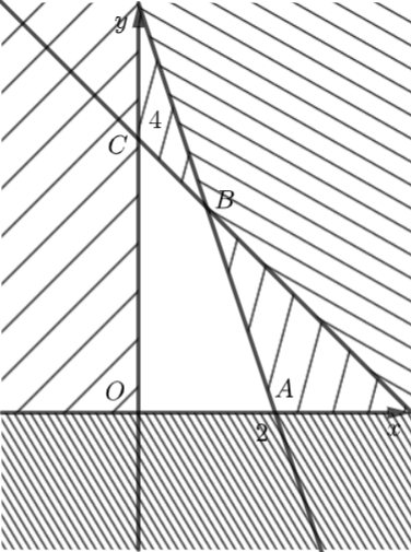 Miền nghiệm của hệ bất phương trình \(\left\{ {\begin{array}{*{20}{c}}{x \ge 0}\\{y \ge 0}\\{3x + y \le 6}\\{x + y \le 4}\end{array}} \right.\) là tứ giác \(OABC\) với \(A\left( {2;0} \right),\) \(B\left( {1;3} \right),\,\,C\left( {0;4} \right).\)