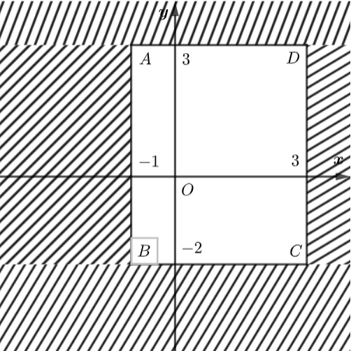 Miền nghiệm của hệ bất phương trình trên là: hình chữ nhật \(ABCD\) với \(A\left( { - 1;3} \right),\,\,B\left( { - 1; - 2} \right),\,\,C\left( {3; - 2} \right),\,\,D\left( {3;3} \right).\)