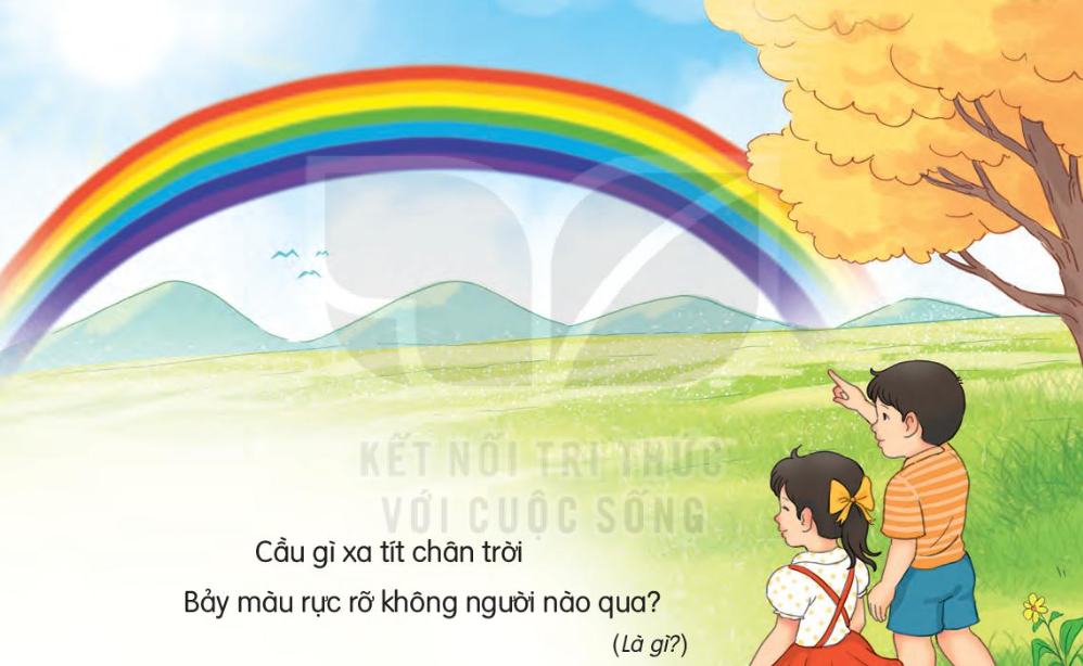 Giải câu đố. Đọc. Tìm trong bài đọc những tiếng có vần ông, ơi, ưa. Cầu vồng thường xuất hiện khi nào. Cầu vồng có mấy màu. Đó là những màu nào. Câu thơ nào cho thấy cầu vồng thường xuất hiện và tan đi rất nhanh. Học luộc lòng một khổ thơ em thích. Viết vào vở tên bảy màu của cầu vồng theo thứ tự dưới đây.